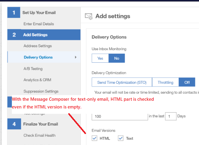 With the Message Composer for text-only email, HTML part is checked even if the HTML version is empty. So if we would like to send text-only email, we should turn off the check box HTML version to avoid send empty messages.