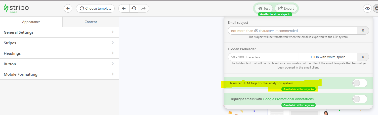 All the major email builders on the market, such as Stripo, Dartagnan, Optimove, and Mailrose Place, feature a field at the top of the email composer for entering tracking codes, which are then automatically integrated into each link in the email.
